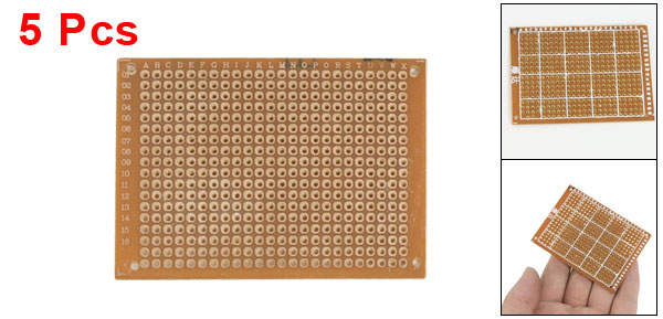 Product Name Universal PCB Board Hole Dia(Approx) 1mm / 0.039" Hole Pitch(Approx) 2.54cm / 0.1" Size(Approx) 50 x 70mm / 2" x 2.76"(W*L) Thickness(Approx) 1.3mm / 0.051" Material FR-4 Color Copper Tone Net Weight 29g Package Content 5 Pcs x Universal PCB Board - Reviews