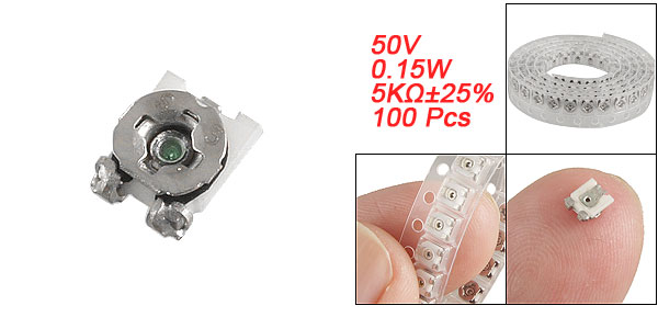 Product Name Potentiometer Quantity 100±2% Pcs Withstand Voltage 50V Rated Power 0.15W Resistance Value 5KΩ (5 000ohm) Tolerance ±25% Mounting Type SMT Turn Number Single Resistance Change Type Linear Resistive Material Carbon Fim Temperature Coefficient ±250ppm/°C Square Body Size 3 x 3mm/ 1/8" x 1/8" (L*W)