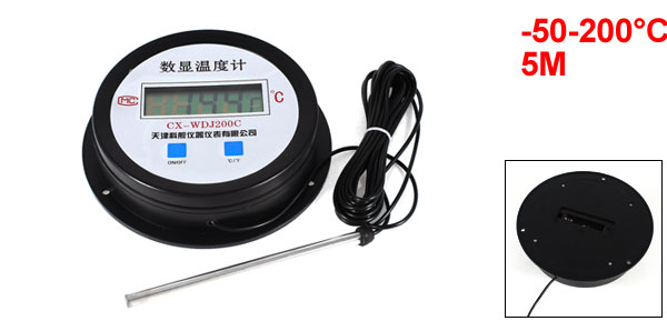 Product Name Digital Thermometer Measuring range -50-200°C Accuracy ±0.5% ±1.0% Powered by 1 x 1.5V AAA Battery(not Included Here) Probe Size 14.5 x 0.8cm/5.7" x 0.3"(L*D) Display Face Size 14.2 x 3.7cm / 5.6" x 1.5" (D*T) Cable Length 5M/16.4Ft Color Black, Gray Weight 230g Package 1 x Thermometer