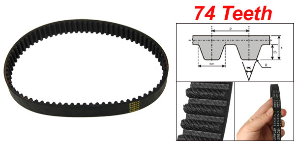 Product Name Timing Belt Model 5M375 Number of Teeth 74 Pitch (P) 5.24mm / 0.206" Tooth Height (th) 3.12mm / 0.128" Tooth Width(tw) 3.08mm / 0.121" Belt Thickness(t) 3.82mm / 0.15" Belt Width 15mm/ 0.59" Belt Inner Girth 39cm / 15.3" Material Rubber, Polyurethane Composite Material Color Black Weight 24g Package Content 1 x Timing Belt - Reviews