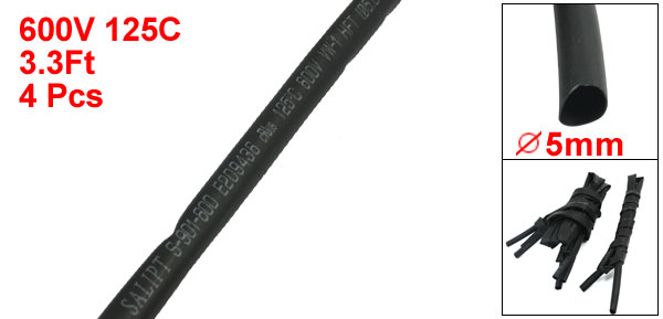 5mm Black Insulated Heat Shrink Tube Shrinkable Pipe 1M 3.3ft 4 Pcs