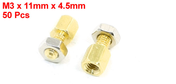 Product Name Standoff Hexagonal Spacer Thread Size M3 Male x M3 Female Male Thread Length 6mm/ 0.24" Body Length 5mm/ 0.2" Total Size(Approx.) 11 x 4.5mm/ 0.43" x 0.06" (L*Max.D) Material Brass Color Gold Tone Net Weight 60g Package Content 50 (±2%) x Standoff Hexagonal Spacer