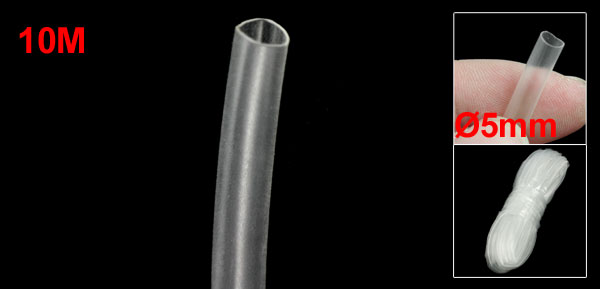 Details5mm Diameter Clear Polyolefin Heat Shrinking Tube 10M 32.8ft  Product Name Heat Shrinkable Tube Material Polyolefin Rated Voltage 600V Temperature Level 125°C Flammability VW-1 Diameter 5mm / 0.197"(Before Shrinking) 2.5mm / 0.098" (After Shrinking) Shrink Ratio 2:1 Length (Approx.) 10M / 32.8ft Color Clear Weight 47g Package Content 1 x Heat Shrinkable Tube
