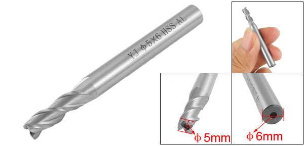 Product Name 3 Flute End Mill Material HSS Color Gray Cutting Diameter 5mm/ 7/21" Cutting Depth 20mm/ 3/4'' Shank Dia. 6mm/ 1/4" Total Length 57mm/ 2 1/4'' Weight 11g Package Content 1 x 3 Flute End Mill - Reviews