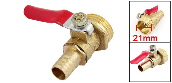 Product Name Ball Valve Type Male Thread to Hose Barb Male Thread Diameter 21mm / 1/2" PT Hose Barb Outside Dia. 5 mm / 0.19" Level Handle Size 44 x 9 mm / 1.7" x 0.4" (L*W) Body Size 41.5 x 16 mm / 1.63" x 0.63" (L*W) Color Brass Tone, Red Material Brass, Metal, Soft Plastic Net Weight 35g Package 1 x Brass Ball Valve - Reviews