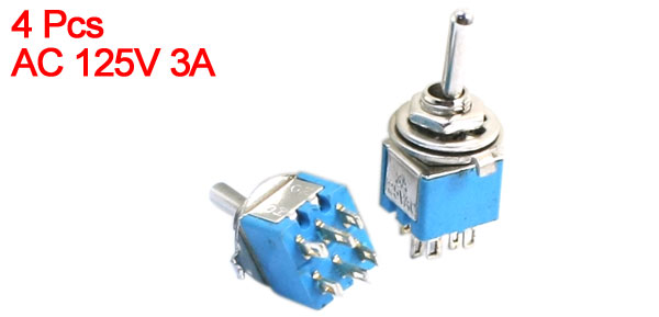 Details5mm Panel Mount ON/ON DPDT Self Locking Toggle Switch AC 125V 3A Blue 4pcs  Product Name Toggle Switch Type DPDT (Latching) Position 2 Positions (ON/ON) Voltage, Current AC 125V 3A Mounting Thread Diameter 5 mm / 0.2" Main Body Size 9 x 8 x 7mm / 0.35" x 0.31" x 0.27" (L*W*H) Overall Height 2.5cm / 1" Color Blue Net Weight 13g Package Content 4 x Toggle Switch