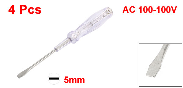 Slotted Head Width 5mm Main Color Clear, Silver Tone Overall Size 16.5 x 2cm/6.5 x 0.79 inches(L*D) Net Weight 88g Country of Manufacture CHINA Package Content 4 x Electroprobe Screwdriver Voltage AC 100-100V Material Plastic, Metal - Reviews