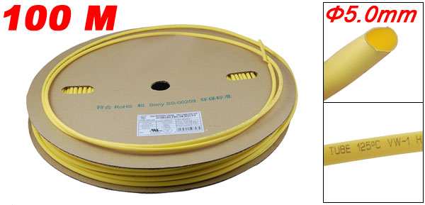 Product Name Heat Shrinkable Tube Material Polyolefin Rated Voltage 600V Temperature Rating 125°C Flammability VW-1 Diameter 5.0mm/0.19" Shrink Ratio 2:1 Packing Length (Approx.) 100M / Roll Package Roll Size 44.5 x 4.5cm / 17.5" x 1.77"(D * H) Color Yellow Weight 984g Package Content 1 x Heat Shrinkable Tube - Reviews