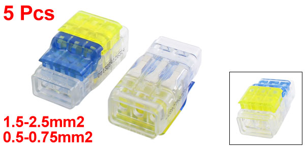 Product Name I-Clamp Wire Connector Connector Type Push in Type Pin Number 3 Material Plastic Color Yellow, Clear Blue Fit Cable 1.5-2.5mm2 to 0.5-0.75mm2 Total Size 4.5 x 2.4 x 1.9cm/1.8" x 0.94" x 0.78"(L*W*H) Net Weight 63g Package 5 x I-Clamp Wire Connector - Reviews