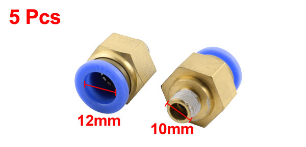 Product Name Quick Coupler Male Thread 10mm Male Thread Length 8mm Fit Tube OD 12mm Overall Size 31 x 24mm/1.2" x 0.94"(H*Max.D) Color Brass Tone, Blue Material Metal Net Weight 112g Package Content 5 x Quick Coupler - Reviews