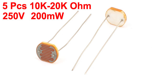 Product Name Photoresistor Model 12528 Light Resistance 10K-20K Ohm Max Voltage (DC) 250V Max Power Consumption 200mW Spectral Peak 560nm Darkness Resistance 2M Ohm Response Time 30ms(Rise), 30ms(Down) Resistance Illumination 3 Operating Temperature -30C to + 70C Head Dia 12mm/0.47" Pin Length 37mm/1.5" Material Electric Part Net Weight 4g Package Content 5 x Photoresistors - Reviews