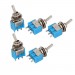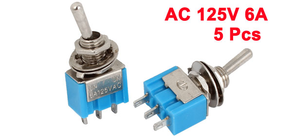 Details5pcs 2 Position SPDT On/On Self-locking Mini Toggle Switch AC 125V 6A  Product Name Toggle Switch Rated Voltage AC 125V, 6A Action Type Latching Pin Number 3 Pins Position 2 Positions (ON/ON) Type SPDT Thread Diameter 5.6 mm / 0.22" Body Size (Not Include Pin) 13 x 10 x 7mm / 0.5" x 0.4" x 0.28" (L*W*T) Total Height 30mm / 1.2" Material Plastic, Metal Color Blue, Silver Tone Weight 25g Package Content 5 x Toggle Switch