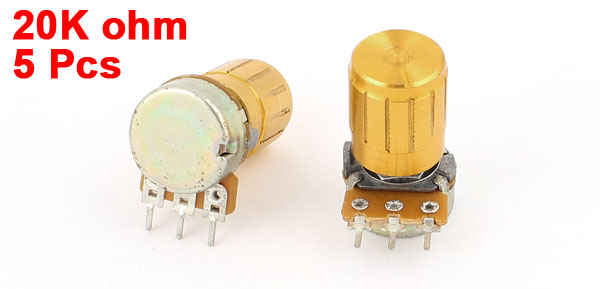 Details5pcs 20K OHM Linear Taper Rotary Potentiometer 20KB B20K Pot w Knobs  Product Name Potentiometer Resistance Value 20K ohm Adjustment Type Top Adjustment Type Single Linear (Type B) Features Knurled Shaft Shaft Diameter 6mm / 0.2" Shaft Length 15mm / 0.6" Mounting Thread Diameter 7mm / 0.28" Base Diameter 16mm / 0.63" Total Height 24mm / 0.94" Knob Size 14 x 17mm / 0.55" x 0.67" (D*H) Material Metal, Electronic Parts,Carbon Film Net Weight 46g Package 5 x Potentiometer