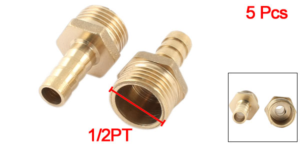 Product Name Brass Hose Connector Material Brass Color Gold Tone Male Thread Dia. 1/2PT(20mm ) Fit for Hose Outer Dia. 10mm / 0.4" Hex Width 21mm/ 0.83" Net Weight 114g Package Content 5 x Brass Hose Connector
