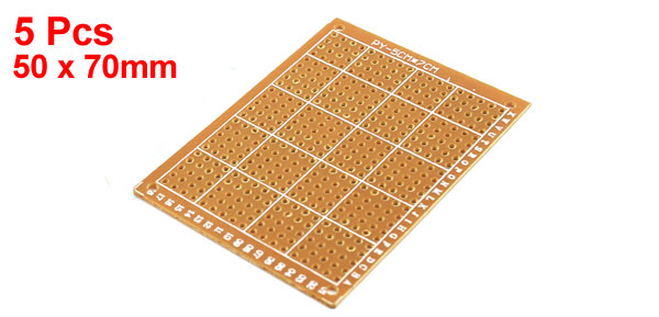 Product Name Universal PCB Board Hole Dia(Approx) 1mm / 0.039" Hole Pitch(Approx) 2.54mm Size(Approx) 50 x 70mm /2" x 2.8"(W*L) Thickness(Approx) 1.2mm / 0.047" Material FR-4, Copper Color Copper Tone Net Weight 124g Package Content 5 Pcs x Universal PCB Board - Reviews