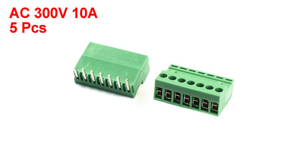 Product Name PCB Terminal Block Power AC 300V 10A Pin Number 7 Pin Pitch 3.96mm / 0.16" for Wire 14-26Awg Total Size 28 x 18 x 10mm /1.1" x 0.7" x 0.4" (L*W*H) Color Green, Silver Tone Material Plastic Weight 35g Package Content 5Pcs x PCB Terminal Block - Reviews