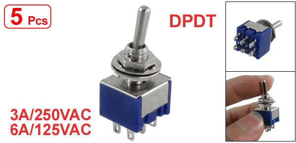 Product Name Toggle Switch Type DPDT (ON/Off/ON) Position 3 Mounting Hole Diamter 5.8mm / 0.228" Voltage & Current 3A/250VAC 6A/125VAC Main Body Size 12.9 x 12.7mm / 0.51" x 0.5"(L*W) Overall Height 32.5mm / 1.28" Material Metal & Resin Main Color Blue Weight 29g Package Content 5 x Toggle Switch - Reviews