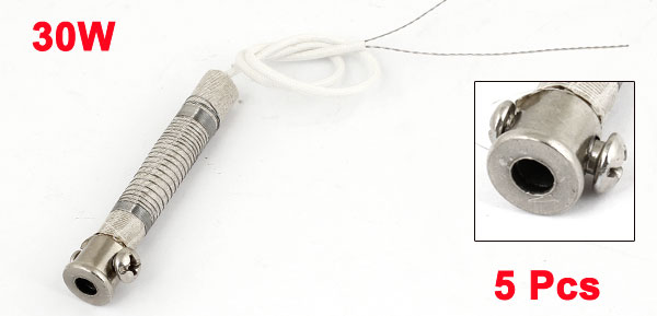 Product Name Heating Element Core Main Material Metal Power 30W Dimension 4.5 x 0.9cm/ 1.8" x 0.4"(L*Max.D) Wire Length 14cm/ 5.5" Color White, Silver Tone Weight 39g Package Content 5 x Soldering Iron Heating Element Cores - Reviews