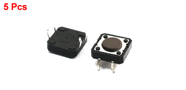Product Name Tact Push Button Switch Contact Type Momentary Total Size(Pin Not Include) 12 x 12 x 4.3mm/0.5" x 0.5" x 0.17"(L*W*T) Button Diameter 7mm/0.28" Material Plastic, Metal, Brown Color Black, Silver Tone Net Weight 5g Package Content 5 Pcs x Tact Push Button Switches - Reviews