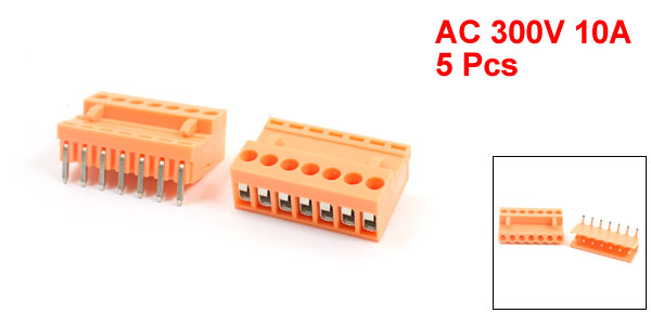Product Name Screw Terminal Block Power AC 300V 10A for Wire Size 14-26A.W.G. Type Right Angle Poles 7 Position Pin Number 7 Pin Pitch 3.96mm / 0.16" Total Size 28 x 18.5 x 10mm /1.1" x 0.72" x 0.4" (L*W*H) Color Orange, Silver Tone Material Plastic Weight 38g Package Content 5Pcs x Screw Terminal Block - Reviews