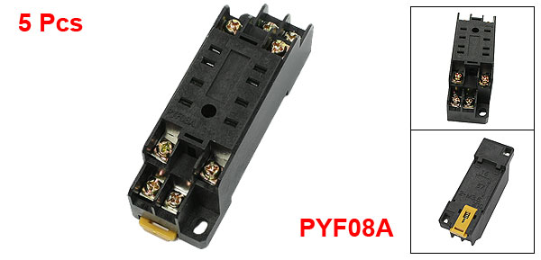 Details5pcs 8 Pin Plug 3mm Din Rail Power Relay Socket Base Holder PYF08A for HH52P  Product Name PYF08A Relay Base Model NO. PYF08A Pin Quantity 8 Total Size (Approx.) 7 x 2.3 x 3cm / 2.8" x 0.9" x 1.2" (L * W *T) Mounting Rail Width 3mm/0.12" Installing Hole Size 4mm/0.16" Installing Hole Spacing 6cm/2.4" Material Plastic, Metal Main Color Black Weight 140g Package Content 5 x PYF08A Relay Base