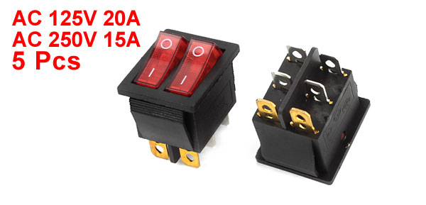 5Pcs AC 125V/20A 250V/15A Red Illuminated Two SPST Waterproof Rocker Switch