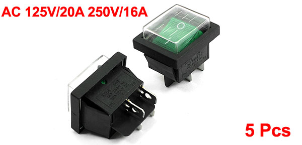 Product Name Waterproof Rocker Switch Connection Type DPST Position On-Off Terminals Number 4 Voltage/Current AC 125V/20A 250V/16A Total Size(Each) 35 x 29 x 36mm/ 1.4" x 1.1" x 1.4"(L*W*H) Mounted Size 29 x 21mm/ 1.1" x 0.83"(L*W) Switch Color Black, Green Button Color Green Material Plastic, Metal Weight 73g Package Content 5 x Waterproof Rocker Switches - Reviews