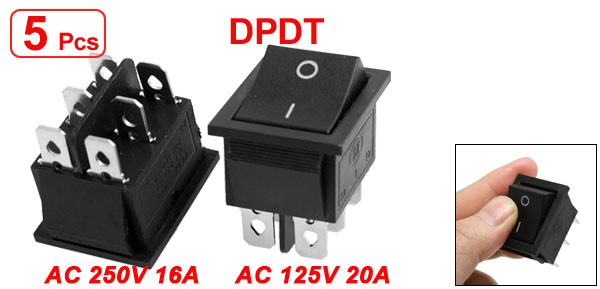 Product Name Rocker Switch Poles DPDT Terminals 6 Pin (On-On) Rating Voltage AC 250V 16A AC 125V 20A Total Size(Each One) 3.2 x 2.5 x 3.4cm / 1.325" x 0.98" x 1.33"(L*W*T) Mounting Size 2.5 x 2.1 x 2.5cm/ 1" x 0.83" x 1"(L*W*T) Color Black Material Plastic, Metal Total Weight 65g Package Content 5 x Rocker Switch - Reviews