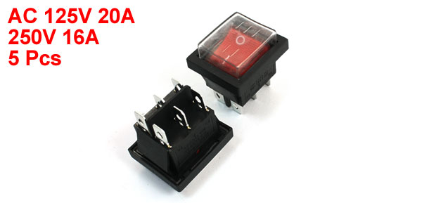 Product Name Waterproof Rocker Switch Connection Type DPDT(I/O) Terminals Number 6 Voltage/Current AC 125V/20A 250V/16A Total Size(Each) 35 x 30 x 36mm/ 1.4" x 1.2" x 1.4"(L*W*H) Mounted Size 30 x 21mm/ 1.2" x 0.83"(L*W) Switch Color Black, Red Button Color Red Material Plastic, Metal Weight 79g Package Content 5 x Waterproof Rocker Switches - Reviews