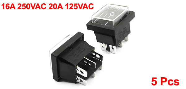 Product Name Rocker Switch Action DPDT Terminals 6 Pin (ON-OFF-ON) Position Number 3 Rating Voltage 16A 250VAC 20A 125VAC Total Size 35 x 29 x 36mm/1.4" x 1.1" x 1.4"(L* W *T) Mounting Dimension 30 x 21mm/1.2" x 0.83"(L*W) Main Color Black, Clear, Silver Tone Material Plastic, Rubber, Metal Total Weight 81g Package Content 5 x Rocker Switch w Cover - Reviews