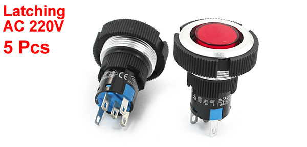 Product Name Push Button Switch Action Type Latching Ith 5A Push Button Rating AC 220V 250V Lamp Voltage AC 220V Lamp Color Red Contact Type SPDT( 1 NO 1 NC) Pin Number 5 Thread Dia 22mm/0.87" Each Size 29 x 33mm/ 1.2" x 1.3" (D*L) Button Dia 15mm/0.6" External Material Plastic External Color Black, Red Net Weight 60g Package Content 5Pcs x Push Button Switch