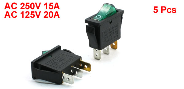 5pcs AC 250V/15A 125V/20A 3P SPST ON/OFF Green Light Boat Rocker Switch