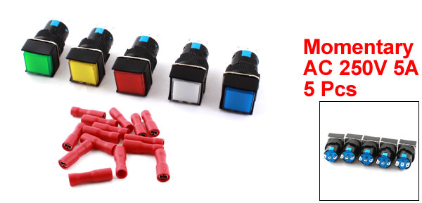 Details5pcs AC 250V 5A Momentary Square Push Button Switch + Female Connector  Item Name Push Button Switch w Crimp Connector Contact Type SPDT(1NO 1NC) Action Type Momentary Pin Number 3 Voltage, Current AC 250V 5A Thread Dia 16mm/0.63" Total Size(Not Included Pin) 17 x 17 x 30mm /0.67" x 0.67" x 1.2" (L*D) Light Color Red, Green, Yellow, Blue, White Material Plastic, Metal Net Weight 50g Package Content 5 x Square Push Button Switch