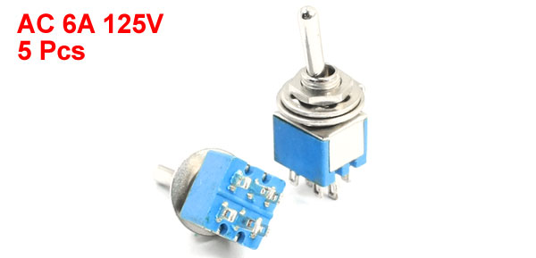 Product Name Toggle Switch Rating AC 6A 125V Pin Number 6 Pins Position 2 Position(On/On) Type DPDT (Latching) Screw Diameter 5mm Total Size(Approx.) 9 x 8 x 22mm /0.35" x 0.3" x 0.87"(L*W*H) Material Metal, Plastic Color Blue, Silver Tone Weight 14g Package Content 5 x Toggle Switch - Reviews