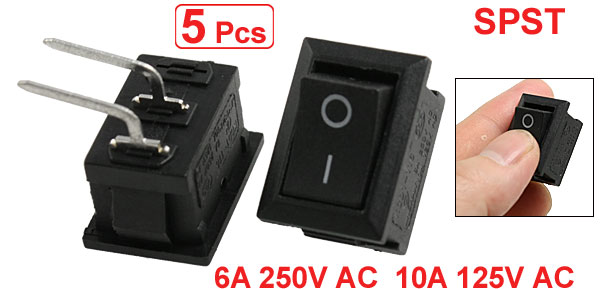Product Name Rocker Switch Poles SPST Terminals 2 pin (On-Off) Rating Voltage AC 250V 6A AC 125V 10A Total Size(Each One) 2.1 x 1.5 x 2.5cm/ 0.82" x 0.6" x 1"(L*W*T) Mounting Size 1.8 x 1.3 x 2cm/ 0.7" x 0.5" x 0.78"(L*W*T) Color Black Material Plastic, Metal Total Weight 16g Package Content 5 x Rocker Switch - Reviews