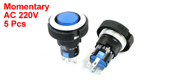 Item Name Push Button Switch Action Type Momentary Type Contact SPDT(1NO 1NC) Ith 5A Switch Rating AC 220V 5A Lamp Voltage AC 220V Lamp Color Blue Pin Number 5 Thread Diameter 22mm/0.87'' Total Size(Not Included Pin) 29 x 32mm/1.2'' x 1.3'' (L*Max.W) Material Plastic, Electric Parts Housing Color Black, Blue Net Weight 60g Package Content 5 Pcs x Push Button Switch - Reviews