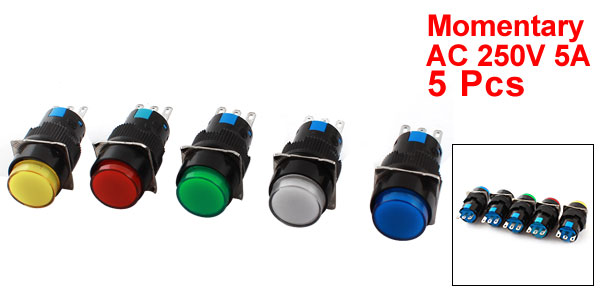 5PCS AC250V 5A Assorted Color Button SPDT Momentary Round Pushbutton Switch 16mm