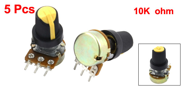 Product Name Potentiometer Resistance Value 10K ohm Adjustment Type Top Adjustment Type Single Linear (Type B) Features Knurled Shaft Shaft Diameter 6mm / 0.2" Shaft Length 13mm / 0.51" Mounting Thread Diameter 7mm / 0.3" Base Size 16 x 7.3mm / 0.63" x 0.29"(D*H) Knob Size 15 x 17mm / 0.6" x 0.8"(D*H) Total Height 31mm / 1.2" Material Metal, Electronic Parts Net Weight 40g Package 5 x Potentiometer - Reviews