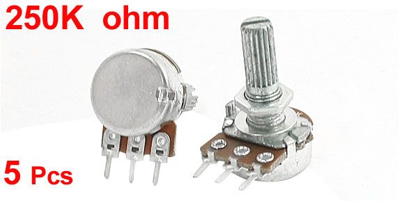 Product Name Potentiometer Resistance Value 250K ohm Adjustment Type Top Adjustment Type Single Linear (Type B) Features Knurled Shaft Shaft Diameter 6mm / 0.2" Shaft Length 13mm / 0.51" Mounting Thread Diameter 7mm / 0.3" Base Size 18 x 7.3mm / 0.71" x 0.29"(D*H) Total Height 29mm/1.14" Material Metal, Electronic Parts Net Weight 37g Package 5 x Potentiometer - Reviews