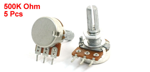 Details5Pcs B500K 13mm Rotating Metal Shaft 3 Soldering Terminals Taper Potentiometers  Product Name Potentiometer Resistance Value 500K ohm Adjustment Type Top Adjustment Type Single Linear (Type B) Features Knurled Shaft Shaft Diameter 6mm / 0.2" Shaft Length 13mm / 0.51" Mounting Thread Diameter 7mm / 0.3" Base Size 18 x 7.3mm / 0.71" x 0.29"(D*H) Total Height 29mm/1.14" Material Metal, Electronic Parts Net Weight 36g Package 5 x Potentiometer