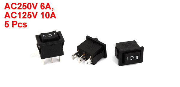 Product Name Rocker Switch Poles SPDT Action Type Latching Terminals 3 Pin (On-Off-On) Rating Voltage AC250V 6A, AC125V 10A Total Size(Each One) 22 x 15 x 27mm/ 0.87" x 0.59" x 1.1"(L*W*T) Mounting Size 19 x 12mm/ 0.75" x 0.47"(L*W) Color Black Material Plastic, Metal Weight 35g Package Content 5 x Rocker Switches - Reviews