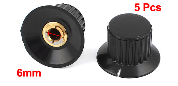 Details5Pcs Black Ribbed Grip 6mm Split Shaft Potentiometer Control Knobs  Product Name Potentiometer Control Knob Model KYP32-20-6J Knob Top Diameter 22mm / 0.71" Knob Base Diameter 32mm / 1" Shaft Insert Diameter 6mm / 1/4" Knob Total Height 20mm / 0.73" Material Plastic, Metal Color Black, Brass Tone Weight 43g Package Included 5 x Potentiometer Control Knob