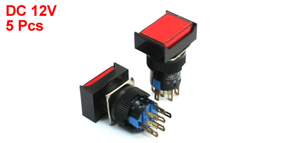 Item Name Push Button Switch Action Type Momentary Contact Type DPDT 2 NO+ 2 NC Button Color Red Light Color Red Light Voltage DC 12V Power AC 250V 5A Mount Hole Diameter 17mm / 0.87" Fit Panel Thickness(Adjustable) Max 6mm / 0.24" Size 23 x 18 x 32mm/ 0.9" x 0.7" x 1.2"(L*W*H) Material Plastic, Metal Weight 50g Package Content 5 x Push Button Switch  - Reviews