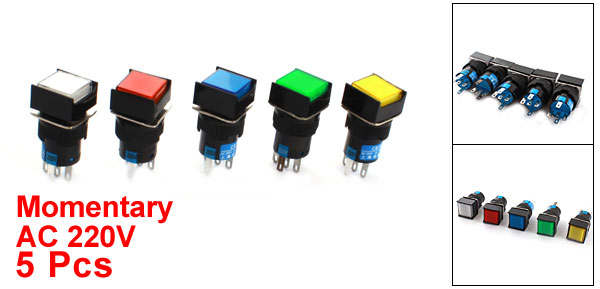 5pcs DC 220V Indicator Light SPDT Non Locking Square Head Pushbutton Switch 16mm