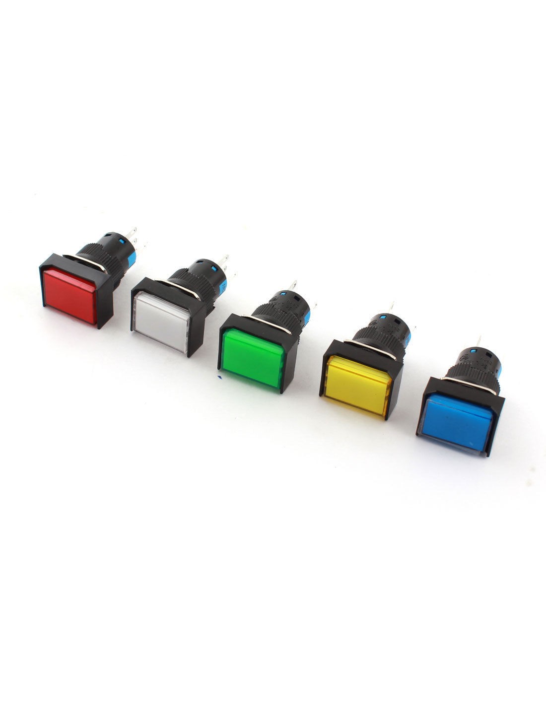 Item Name Rectangle Head Push Button Switch Model CB160-16A Contact Type SPDT(1NO 1NC) Action Type Momentary Pin Number 5 Voltage, Current AC 250V 5A Light Voltage DC 24V Thread Dia 16mm/0.63" Total Size(Not Included Pin) 31 x 24 x 18mm /1.2" x 0.9" x 0.7" (L *W *H) Light Color Green, Blue, White, Red, Yellow External Color Green, Blue, White, Red, Yellow, Black Material Plastic, Metal Net Weight 42g Package Content 5 x Rectangle Head Push Button Switch - Reviews
