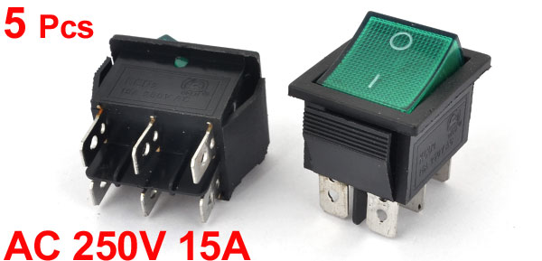 Product Name Rocker Switch Poles DPDT(I/O) Terminals 6 Pin Rated Voltage AC 250V 15A Total Size 35 x 26 x 36mm / 1.4" x 1" x 1.4"(L*W*T) Mounting Size 28 x 21mm / 1.1" x 0.8"(L*W) Color Black, Green Material Plastic, Metal Net Weight 64g Package Content 5 x Rocker Switch - Reviews