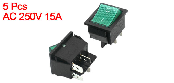 Item Name Rocker Switch Contact Type DPST Position 2(On/Off) Terminals 4 Pin Voltage & Current AC 250V 15A Button Color Green Overall Size 26 x 32 x 35mm/1" x 1.3"x 1.4"(L*W*H) Mounting Hole Size 26 x 22mm / 1" x 0.8"(L*W) Color Black, Green, Silver Tone Material Plastic, Metal Net Weight 59g Package Content 5 x Rocker Switch - Reviews