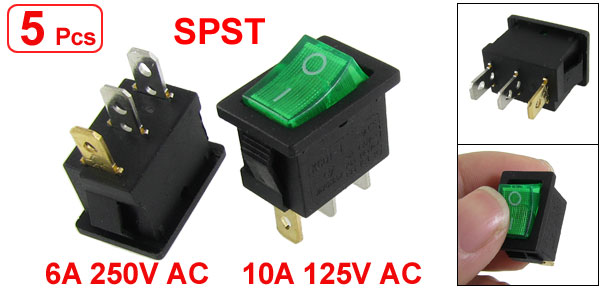 5pcs Green Light ON-OFF I/O SPST Snap In Rocker Switch 3 Pin 6A/250V 10A/125V AC