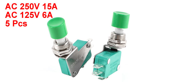 5Pcs Green Pushbutton SPDT 1NO 1NC Miniature Micro Switch AC 15A/6A 250V/125V