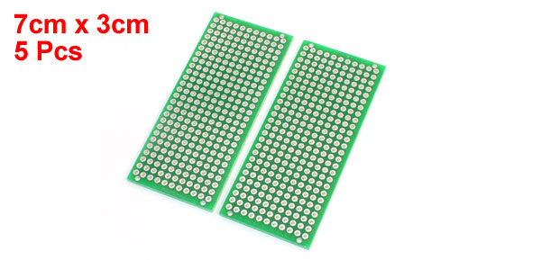 Product Name Double-Sided PCB Board Hole Pitch 2.54mm Total Size 7 x 3cm/ 2.8" x 1.2"(L*W) Thickness 1.6mm Materials PCB, Tin Plated, Glass Fiber Main Color Green, Silver Tone Weight 31g Package Content 5Pcs x Double-Sided PCB Board - Reviews